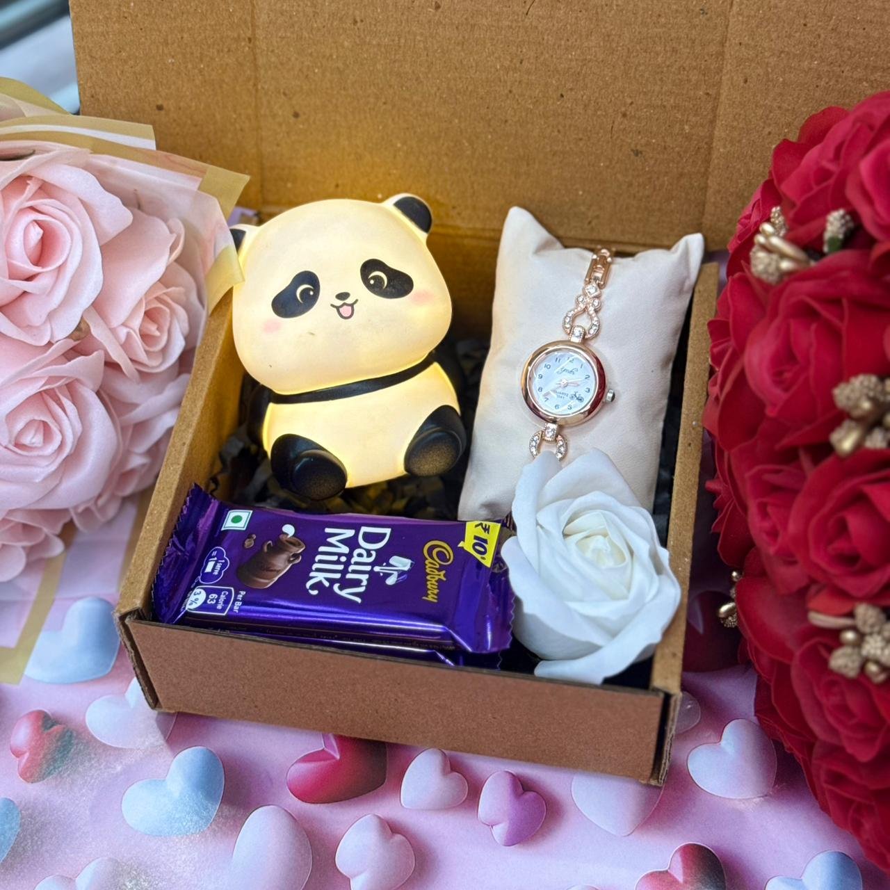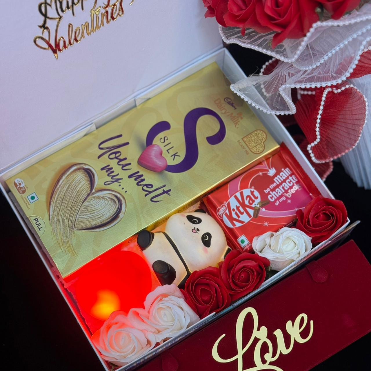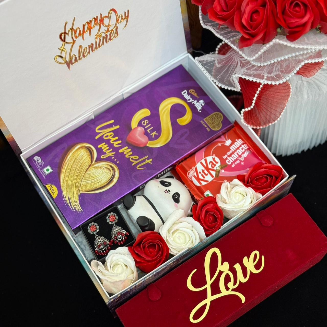 with permium Earing Box if any details mention In Order Note 💝Valentines Dairymilk Hearts Mini panda or Rabit or Chinchan Chocolate Rose Perimum box 10-8 Valentine’s Day 4D cutting