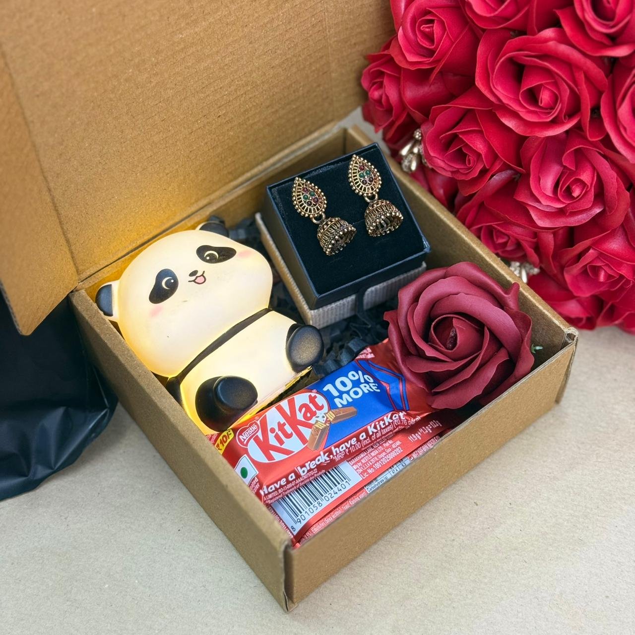 if any details mention In Order Note 💝Valentines Day Dairy Milk Big size Two set earrings Mini panda 🐼 Chocolate 🍫 Rose 🌹 Valentines Day 4D Cutting ( customized birthday, love, anniversary, engagement extra) Perimum box (10-8)